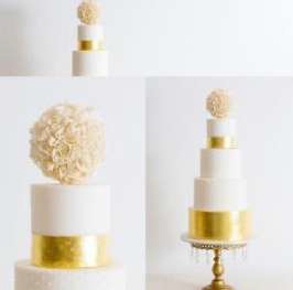 Bottom 2 Tier are dummies, 7 lbs. “real”, 2-tiers real, 7 lbs. edible gold covering, handmade edible “Flower Ball” topper – this cake requires 1 week advance notice please.